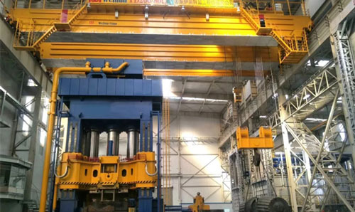 When the forging crane is working, the main and auxiliary hooks cooperate to lift the forgings, and the forgings are rotated by the special spreader. Adjust the forging to a suitable angle, put it on the cutting board of the hydraulic press, and the hydraulic press starts to work until the forging is forged into a qualified product. Since the crane will be subjected to relatively large shock loads during the forging process, it is equipped with a buffer device and a brake release device.